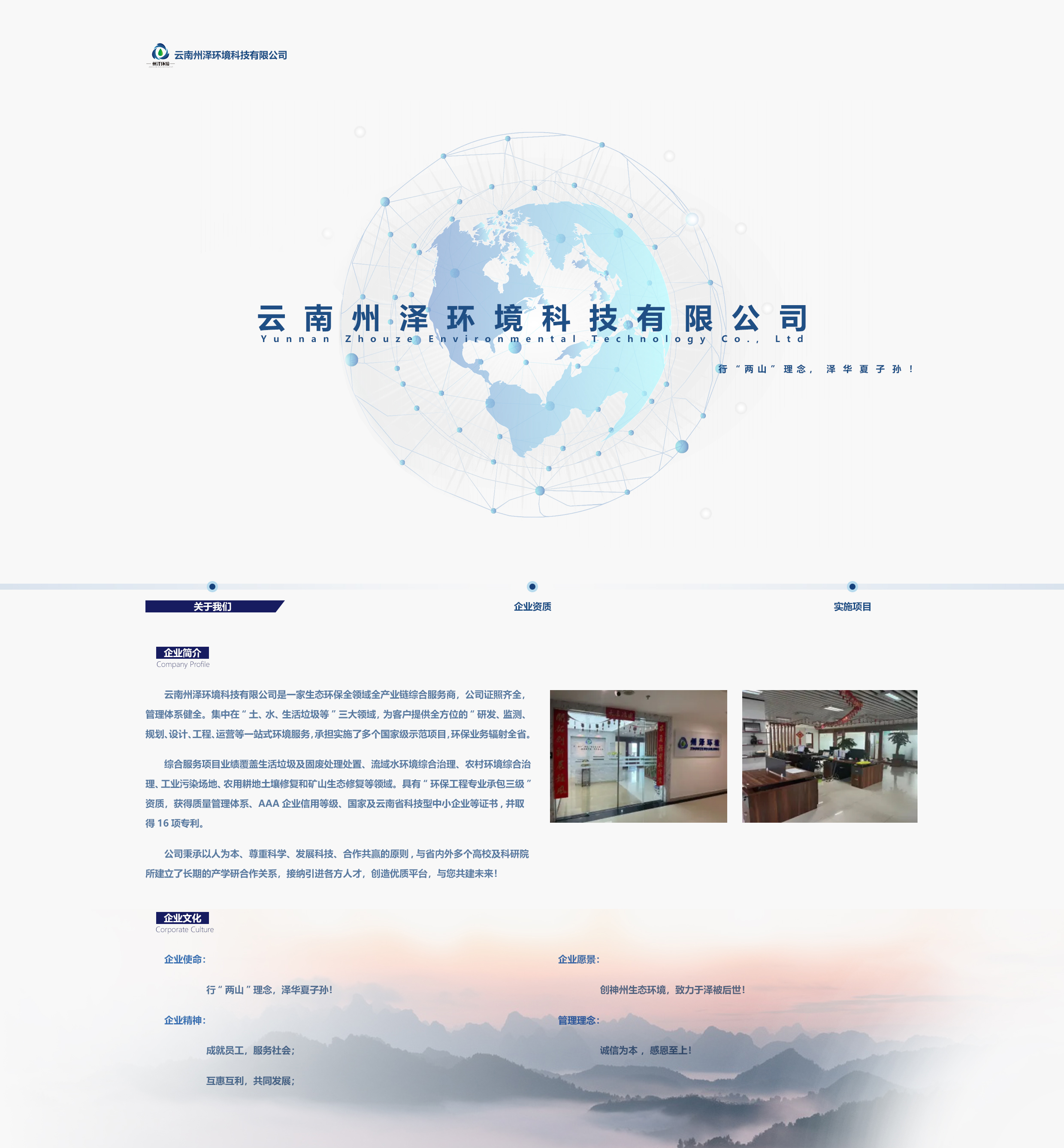 云南州澤環(huán)境科技有限公司是一家生態(tài)環(huán)保全領(lǐng)域全產(chǎn)業(yè)鏈綜合服務(wù)商,公司證照齊全,管理體系健全。集中在“土、水、生活垃圾等”三大領(lǐng)域,為客戶提供全方位的“研發(fā)、監(jiān)測(cè)、規(guī)劃、設(shè)計(jì)、工程、運(yùn)營(yíng)等一站式環(huán)境服務(wù),承擔(dān)實(shí)施了多個(gè)國(guó)家級(jí)示范項(xiàng)目,環(huán)保業(yè)務(wù)輻射全省。